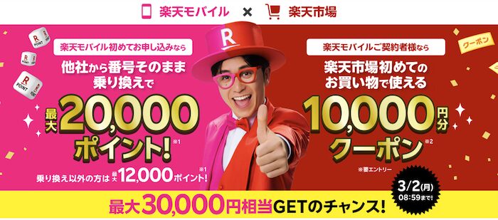 【2026年2月最新】楽天モバイル新規加入で最大30,000円相当お得!20,000P+10,000クーポン解説