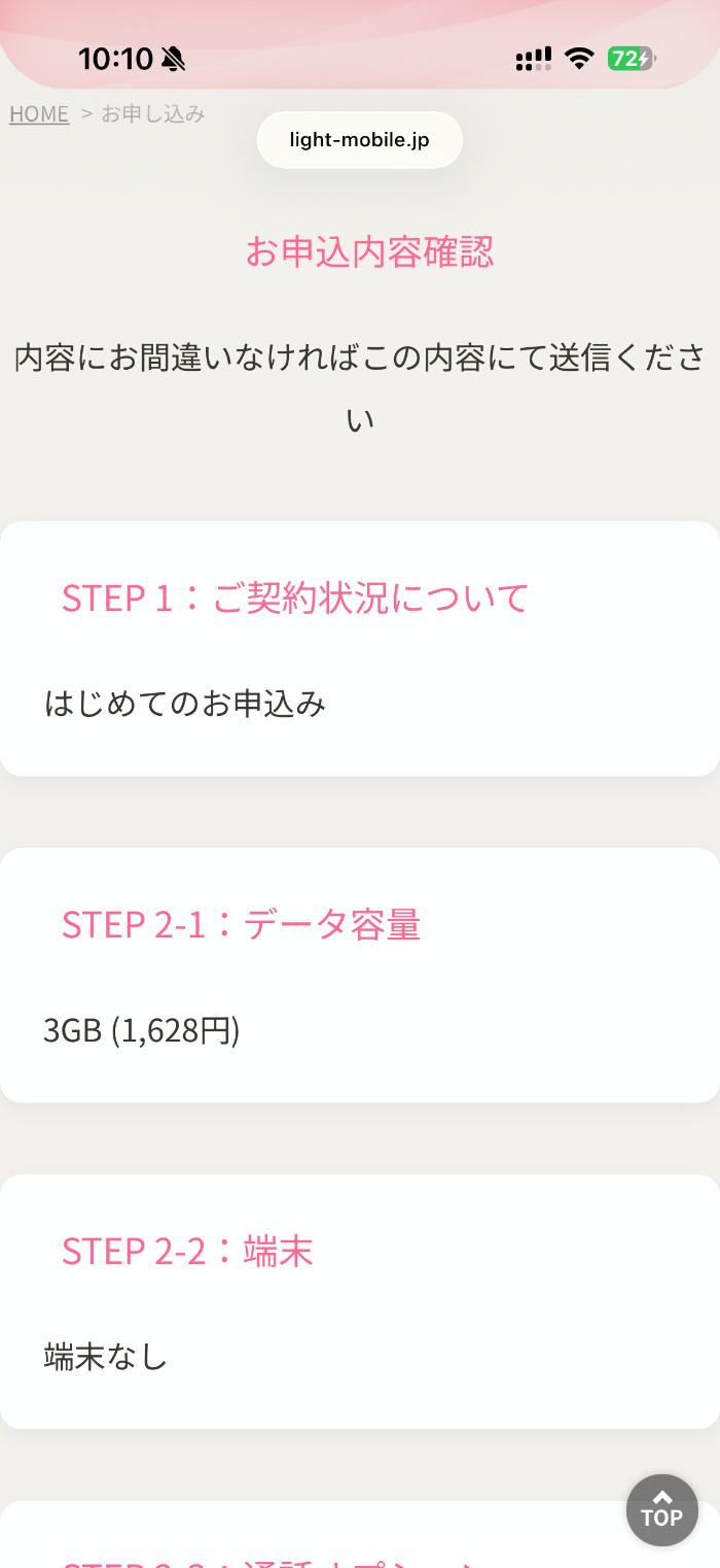 無事本人確認が終了したら、申込内容の確認です。