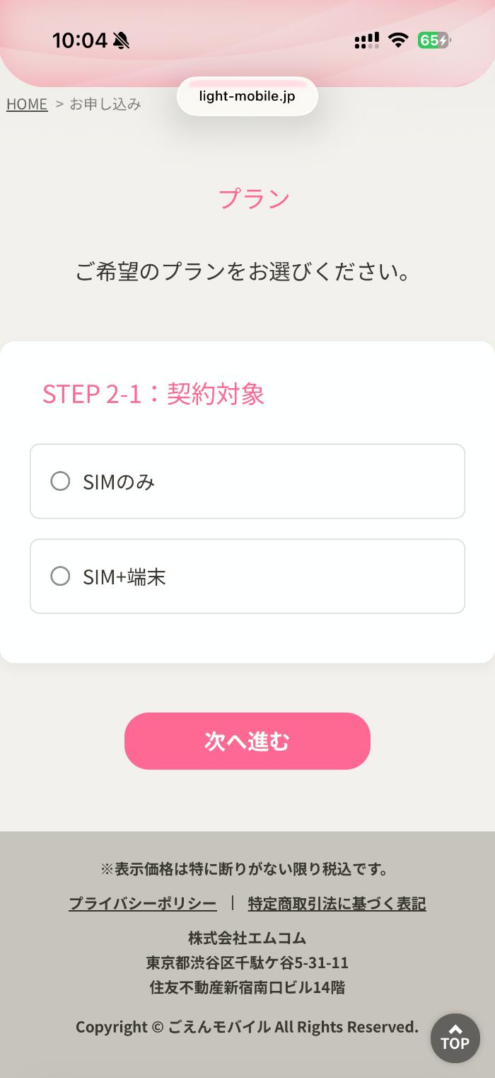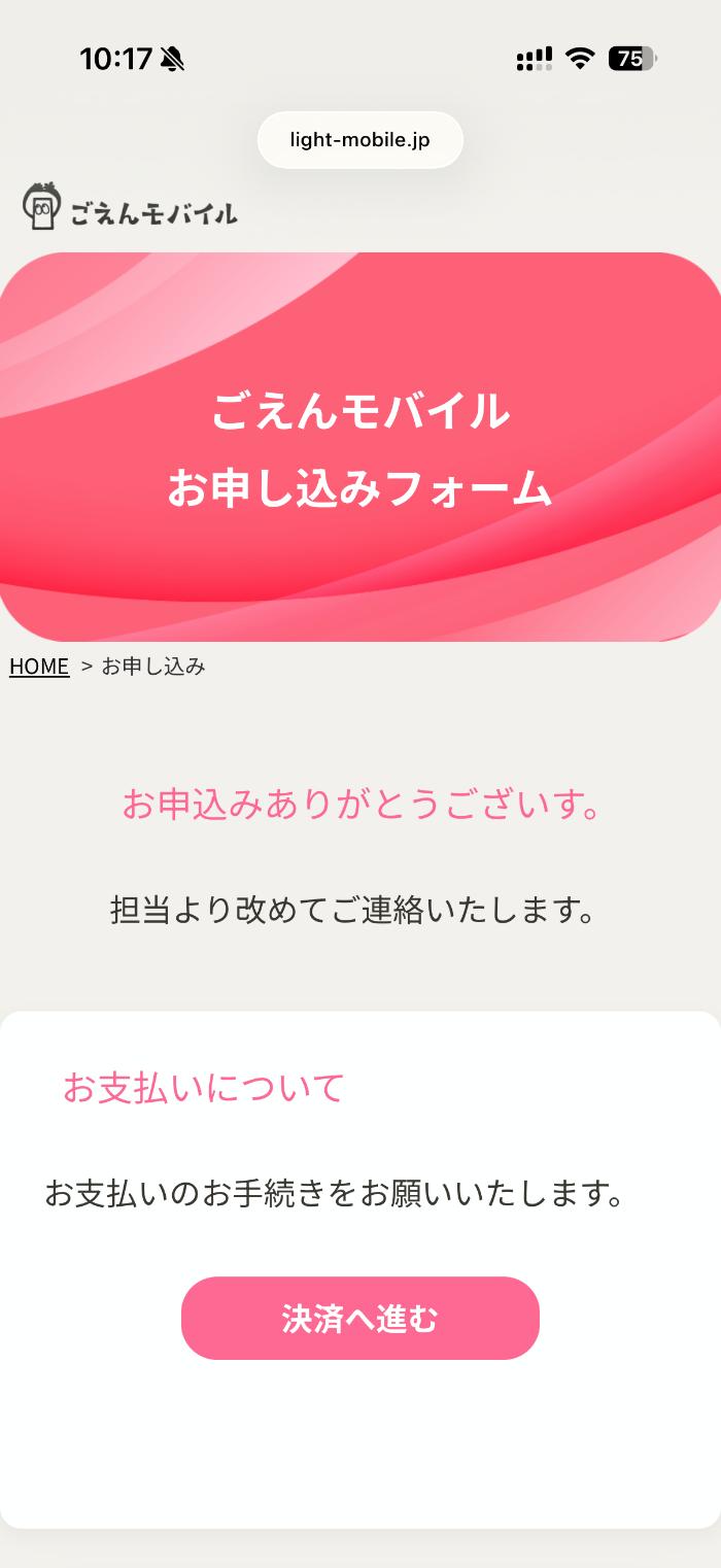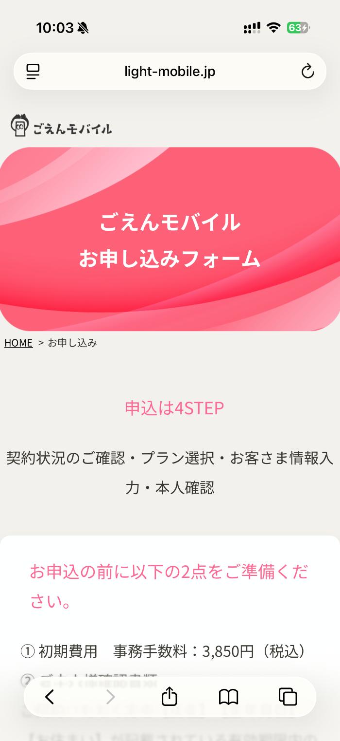 ここからは実際に「ごえんモバイル」に申し込みした様子をレビューします。と言っても、表示されている通りに進めていくだけなので超簡単です。