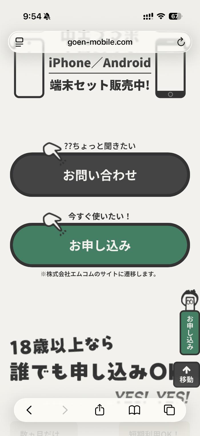ごえんモバイル公式サイトで「お申し込み」ボタンをタップ。申し込み前に気になる事がある場合には、「問い合わせ」もできます。