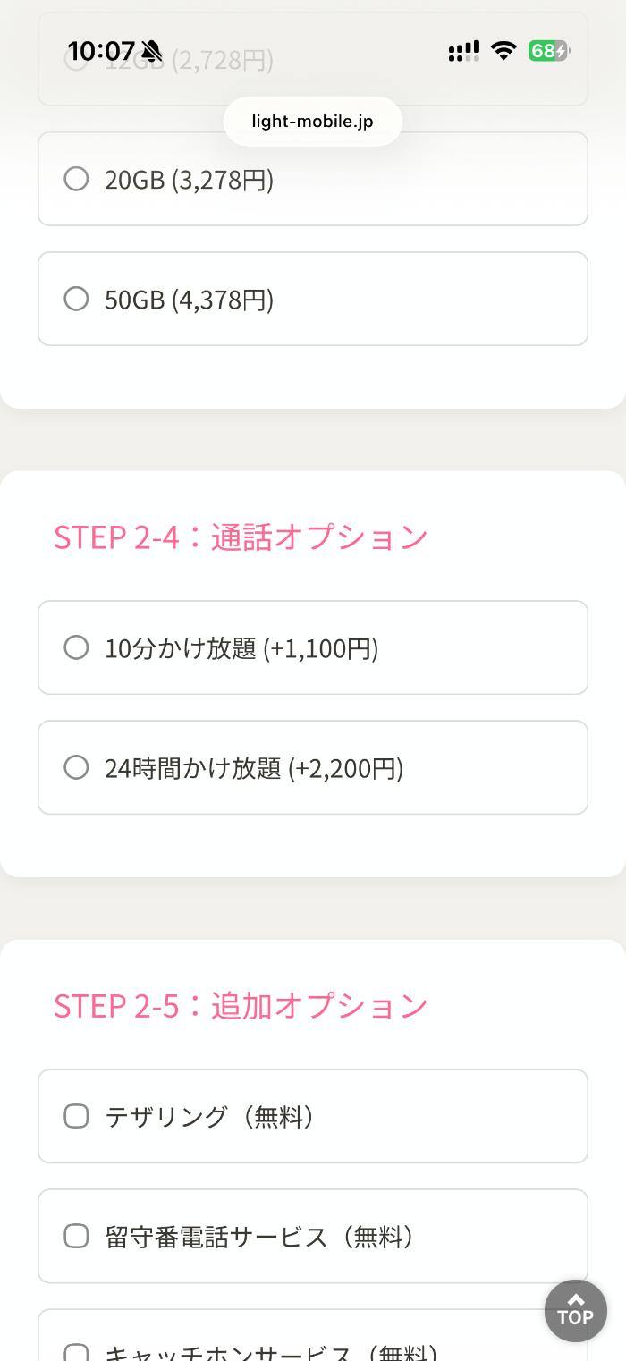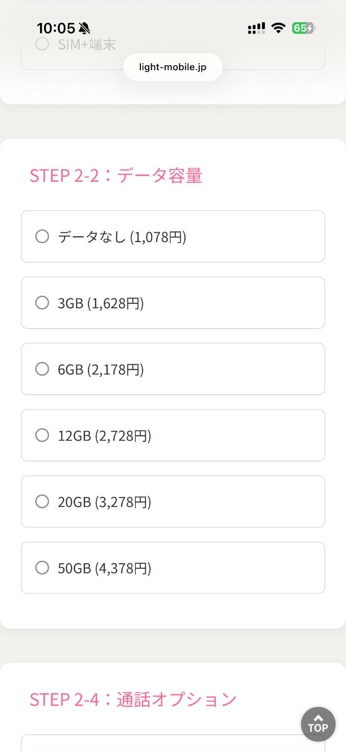 SIMのみか端末(主に中古iPhoneを販売中)も購入するのか。データ容量はどうするのか、オプションは付けるのか。