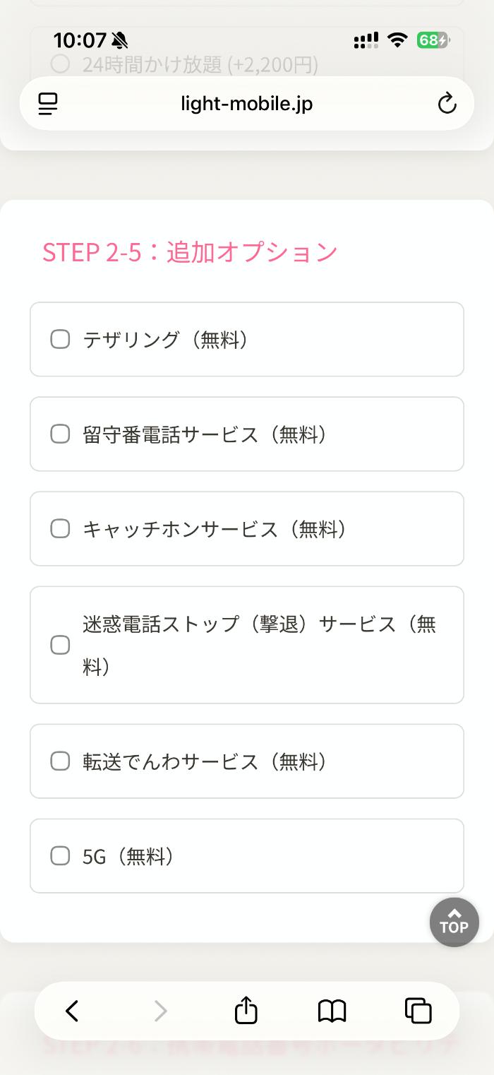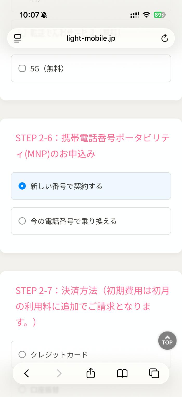 申し込み専用ページに遷移。質問形式で進めていきます。