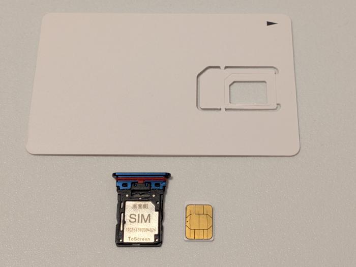 SIMカードは、1枚の台紙から標準SIM、microSIM、nanoSIMの3サイズに切り離して使えるマルチカットタイプ。近年発売されたスマホの殆どが「nanoSIM」だと思います。