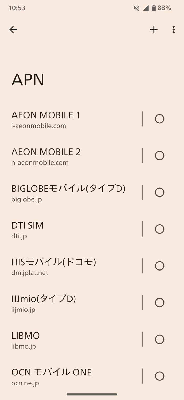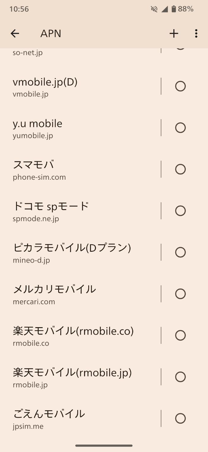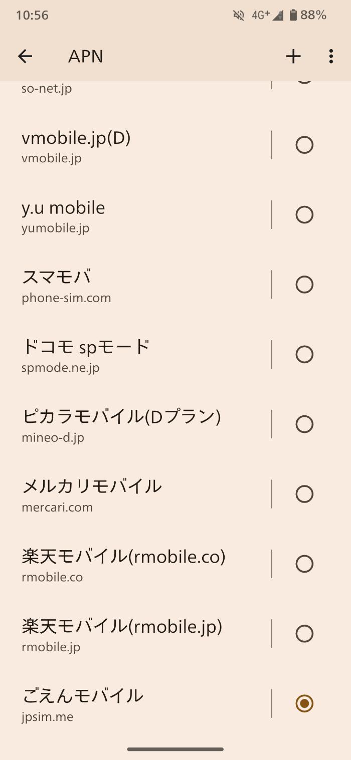 アクセスポイント名をタップすると色んなキャリアが表示されていると思います。ごえんモバイルはこの中にはないので自分で作成。