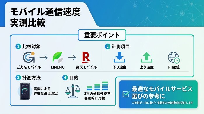 計測アプリは「Speedtest by Ookla」を使用し、朝・昼・夜の3回帯で3日間連続、計9回測定。LINEMOと楽天モバイルとも同じ条件で比較しました。