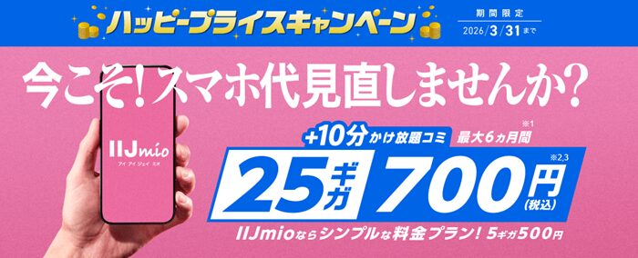 格安SIMのIIJmioが2026年2月3日から2026年3月31日まで「ハッピープライスキャンペーン」を開催中。