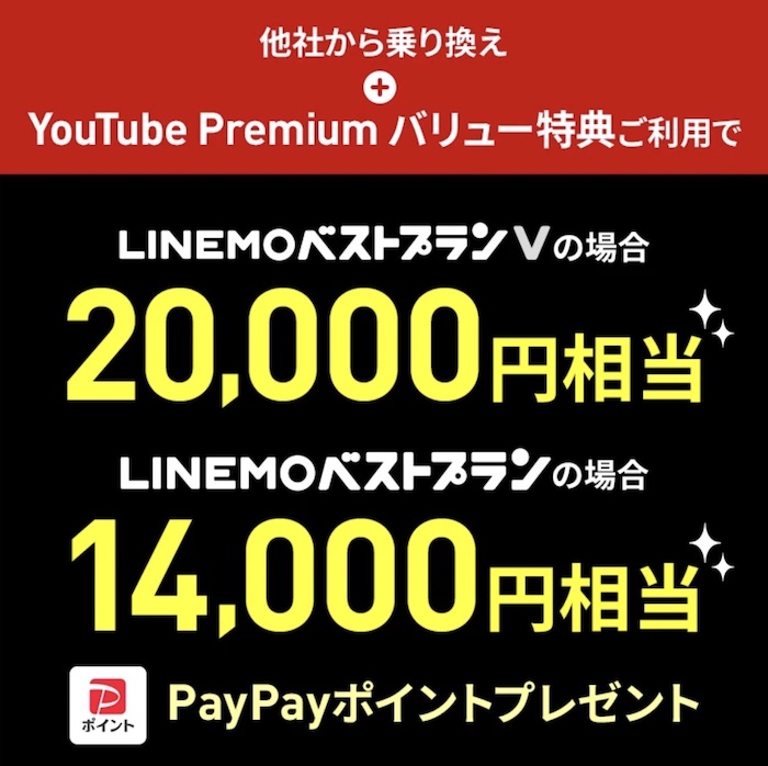 期間中LINEMOに新規加入+YouTube Premium バリュー特典利用でプランに応じて以下のとおりPayPayポイントを付与しております。