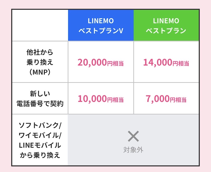新しい電話番号での新規加入(純新規)・他社からのMNPどちらも特典付与の対象ですが、プランによって特典額が異なります。