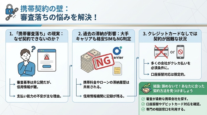 - 過去の滞納で大手キャリアも格安SIMもNG判定