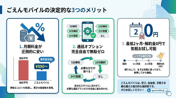 比較表で一目瞭然、ごえんモバイルには3つの決定的強みがあります。