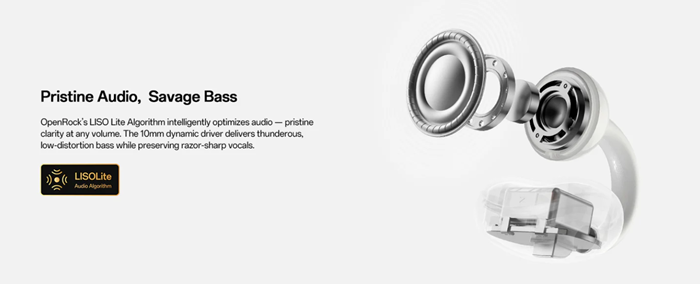 LISOLiteはOpenRockイヤホンに搭載された独自の音響アルゴリズム技術で、クリアでバランスの良い高音質の音を実現します。音の歪みを抑えながら低音から高音まで幅広い周波数で純粋なサウンドを提供し、臨場感溢れる音響体験をサポートします。主にオープンイヤー型イヤホンに最適化されており、周囲の環境音を取り込みつつ安全に音楽を楽しめるのが特徴です。屋外スポーツや通勤利用に適した設計と組み合わせ、快適かつ高性能なリスニング体験を追求しています。