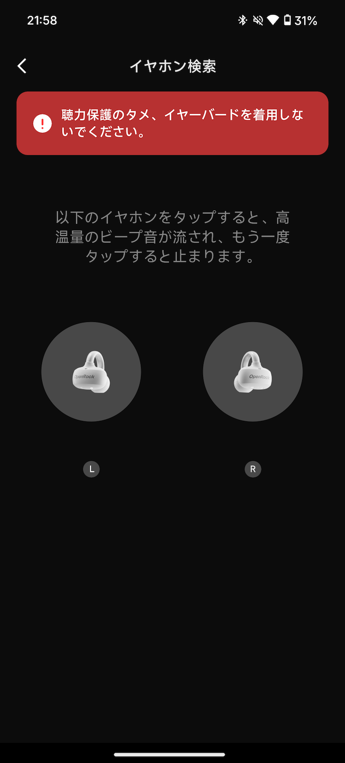 OpenRock Eは、Googleの「Find Hub(デバイスを探す)」には対応していないものの、OpenRockアプリの「イヤホン検索」機能で音を鳴らすことはできました。