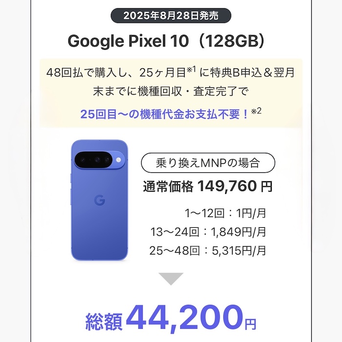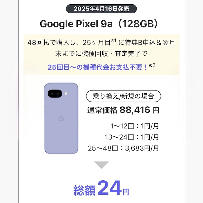 20,000円のキャッシュバックがあれば、2年総額44,200円のGoogle Pixel 10が実質24,200円。そして、2年総額24円のGoogle Pixel 9aは実質無料になります。
