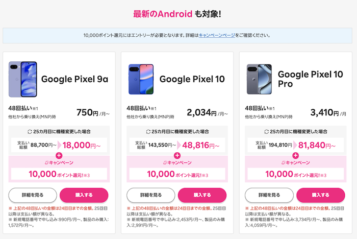 Google Pixel 9aも本プログラムの対象機種となっており、月々の負担を抑えながら利用できます。