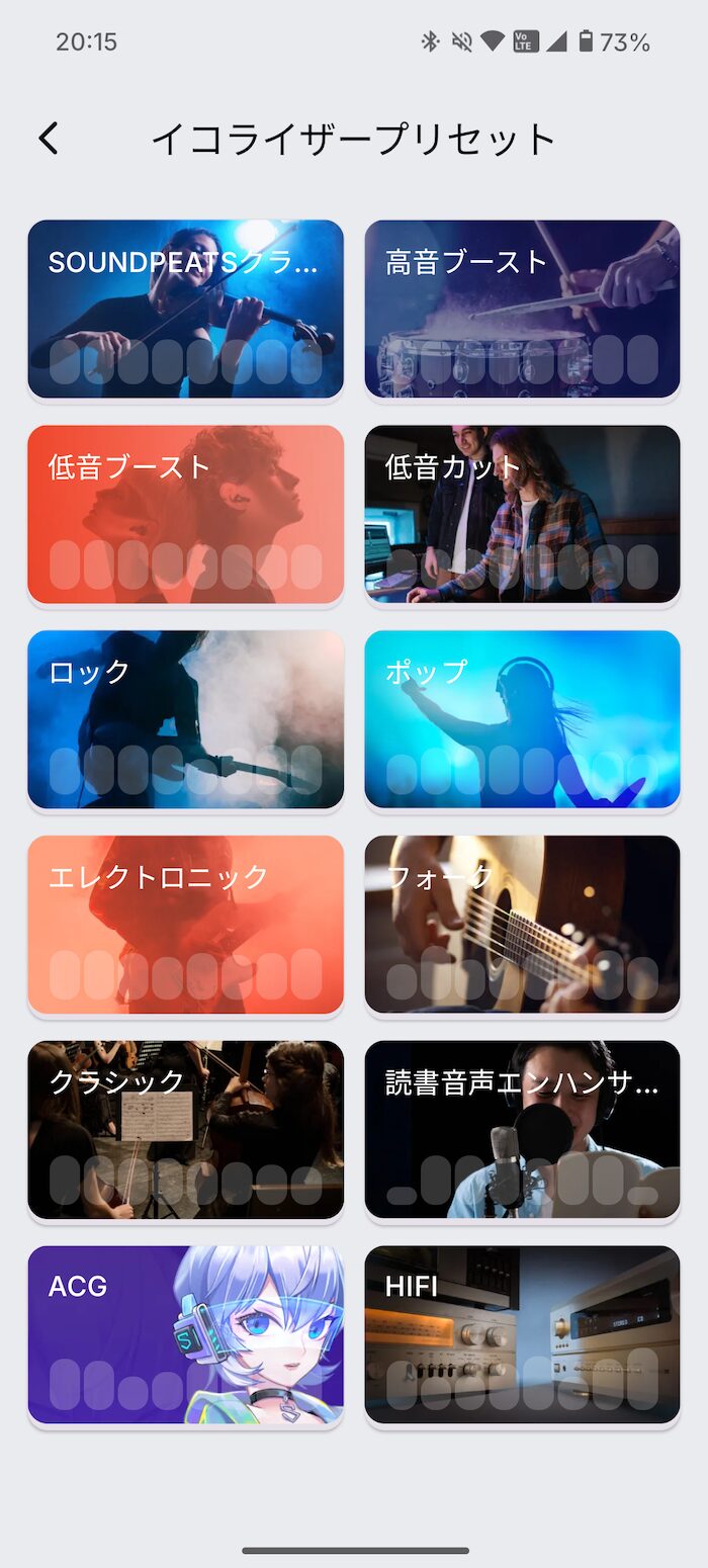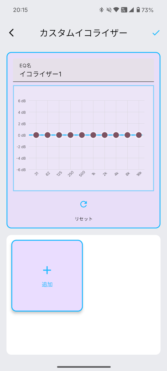 用意されているプリセットのほか、カスタムイコライザーでは各音域-6から+6まで13段階の調節ができます。