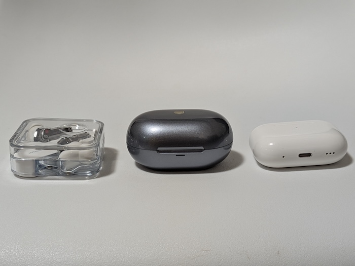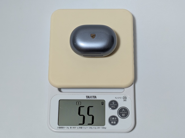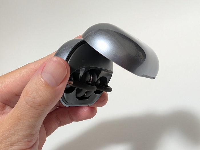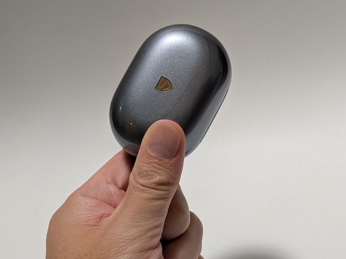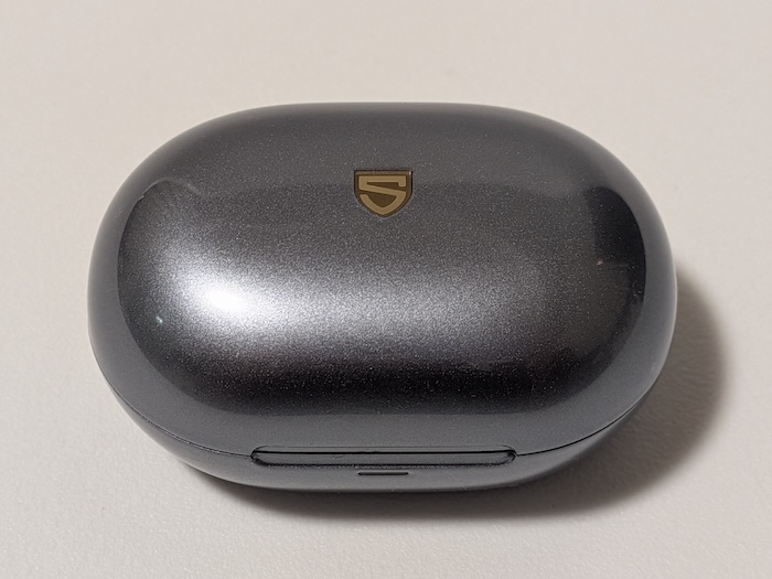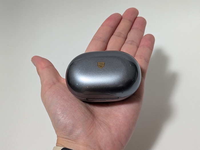 充電ケースは樹脂製でいつもの質感なのですが、マットブラックが多いワイヤレスイヤホンにしては珍しいデザイン。スペーシーな雰囲気が漂っていてかっこいいですね。
