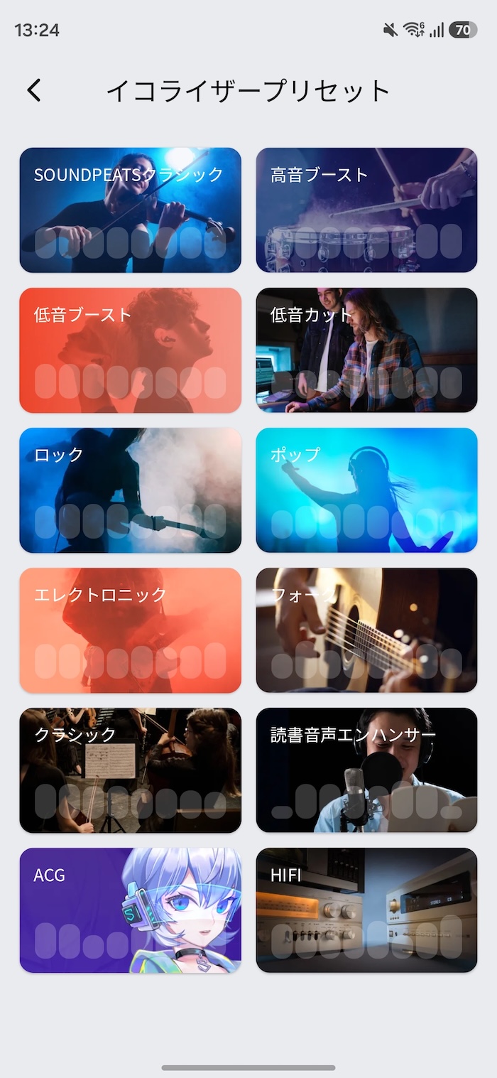 イコライザーのプリセットは12種類。