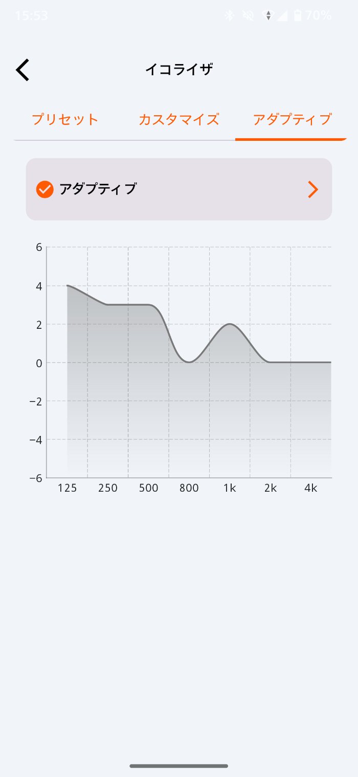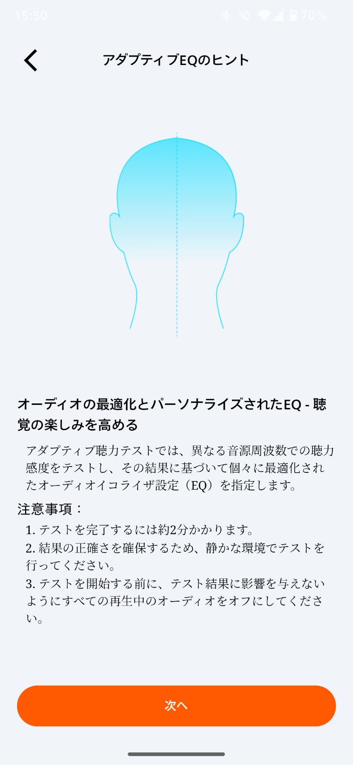 また「アダプティブEQ」では、聴力検査のようなテストをして自分の「聞こえ」に合ったイコライザーを生成することも可能です。