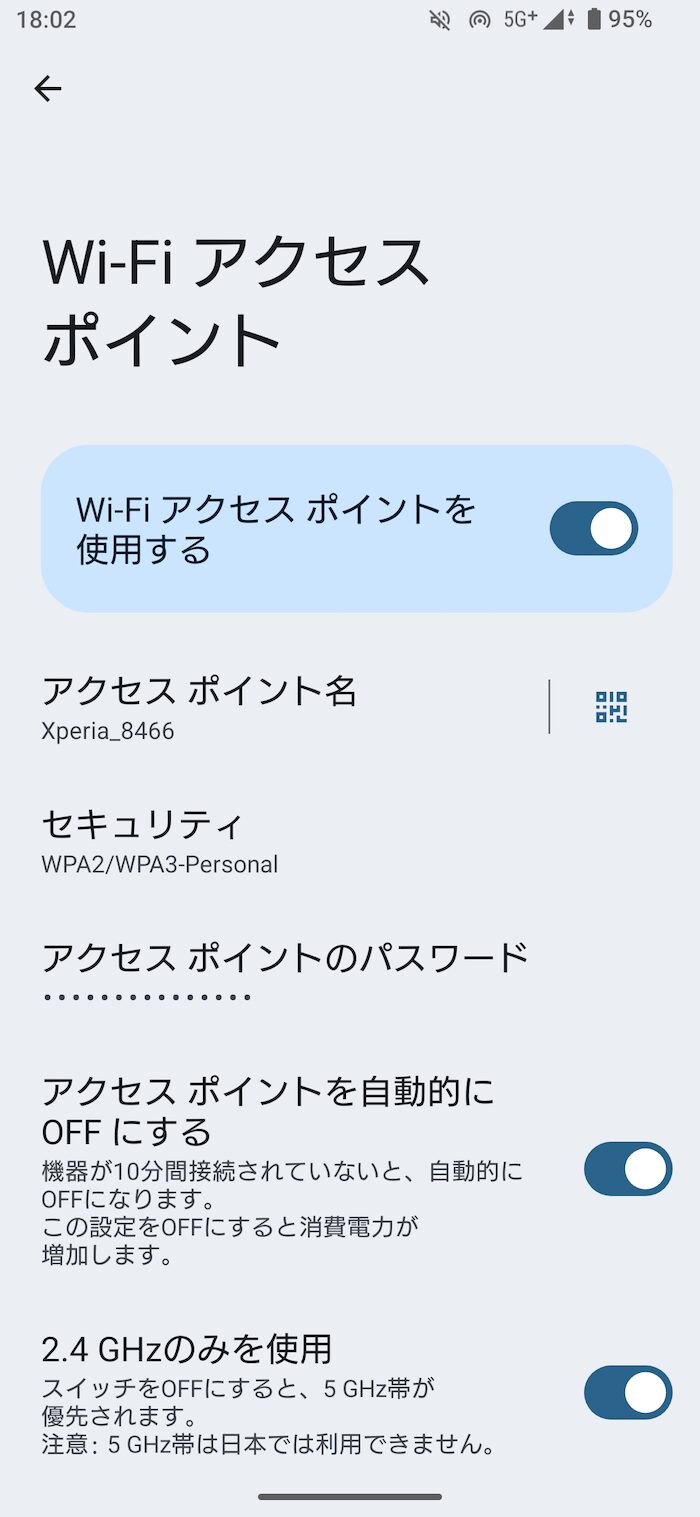 設定内「アクセスポイントとテザリング」から「Wi-Fiアクセスポイント」を有効に。