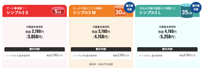 | シンプル3 S | 5GB | 3,058円 |