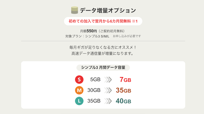 また、3プランともデータ増量オプション(税込550円/月)に加入するとデータ容量が増やせます。
