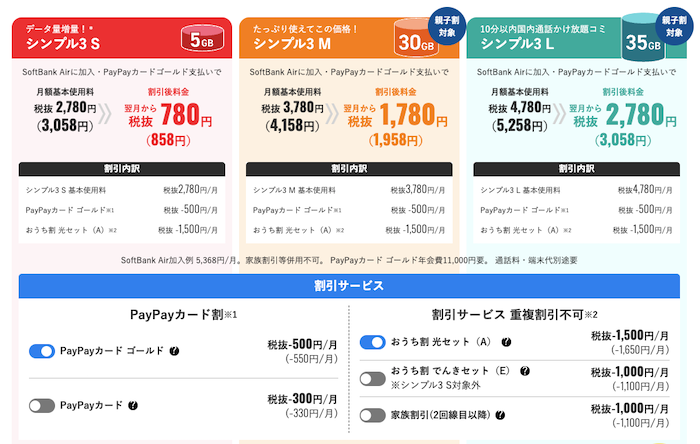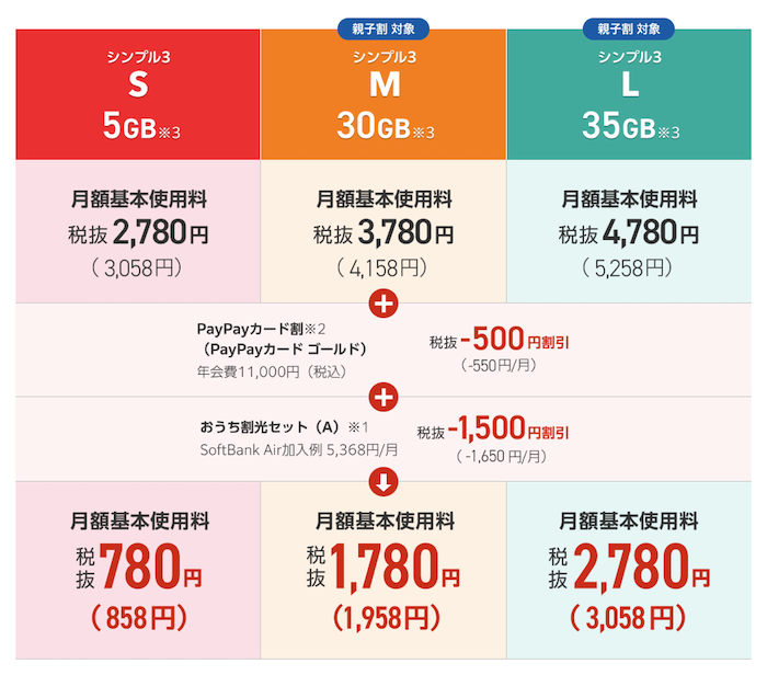 ワイモバイルのスマホ向けプランは、現在「シンプル3」の1本のみです。データ容量に応じてS・M・Lの3種類から選べます。