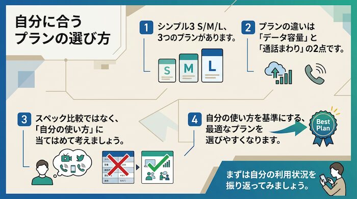 プランの選び方はシンプルで、データ使用量が5GB以下ならS、動画やテザリングをよく使うならM、通話も多いならLが合っています。